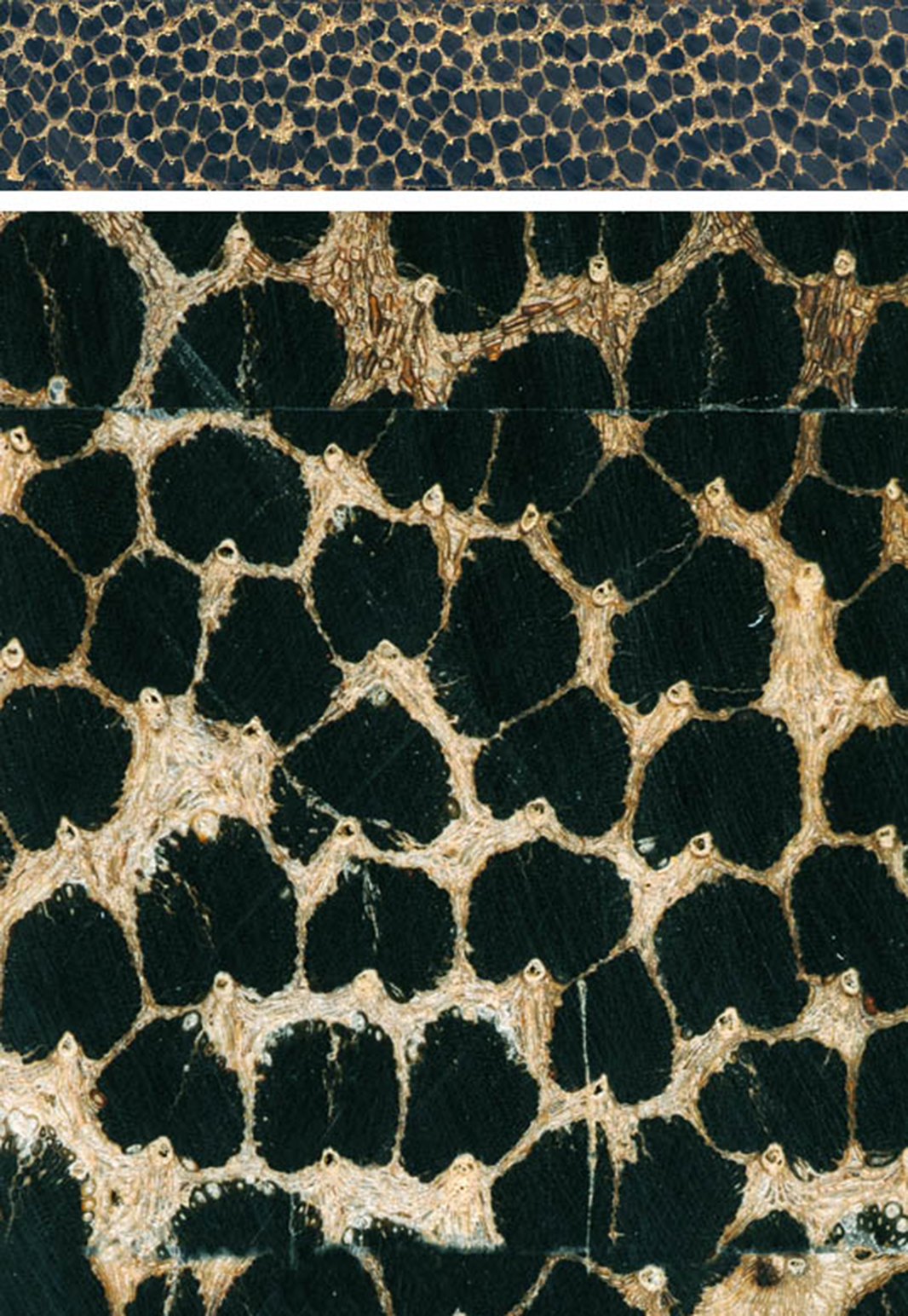 | Farbe und Struktur | Im Gegensatz zur Kokospalme wird bei diesen beiden Palmen nur der dichte und harte äußere Stammbereich (etwa 1/4 bis 1/3 des Radius) wirtschaftlich genutzt. Der zentrale Kern der Bäume besteht zum größten Teil aus weichem, parenchymatischen Grundgewebe und enthält nur wenige der dunkleren Gefäßbündel, deren hohe Konzentration dem Gewebe im äußeren Stammabschnitt seine charakteristische schwarzbraune Farbe und Härte verleihen. Faserverlauf gerade, getrocknet ohne charakteristischen Geruch. |