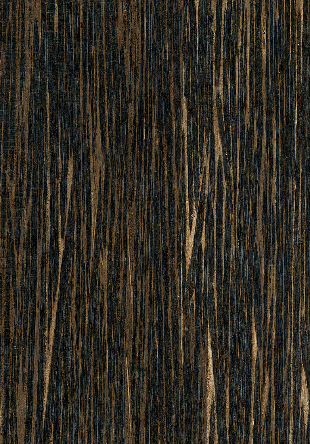 | Gesamtcharakter | Dunkel bis nahezu schwarz, leicht bräunlich meliert ohne Zuwachszonen und mit einer dekorativen Maserung, die durch den Farbkontrast zwischen dem etwas hellerem Grundgewebe und den dunklen Faserbündeln geprägt ist. |